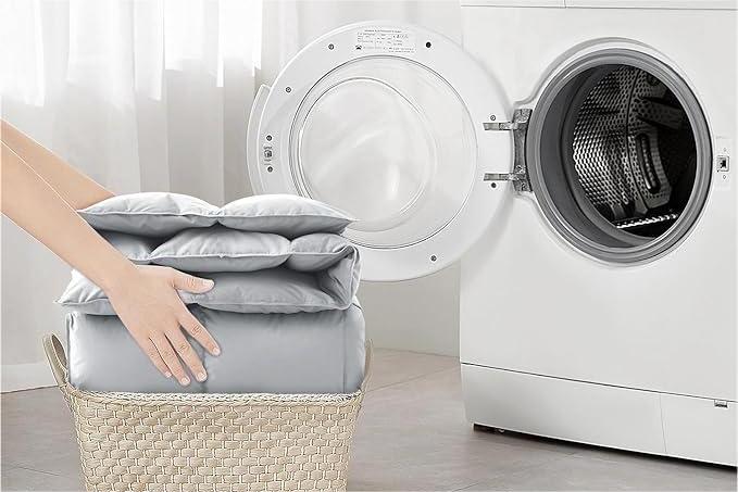 Our down comforter is not just about luxurious warmth, but also about convenience. You can easily machine wash it in a front loader machine on a gentle, ensuring it remains fresh and cozy night after night. Say goodbye to the hassle of dry cleaning and enjoy the comfort of a clean and fluffy down comforter. With our product, you can have both comfort and convenience at your fingertips.