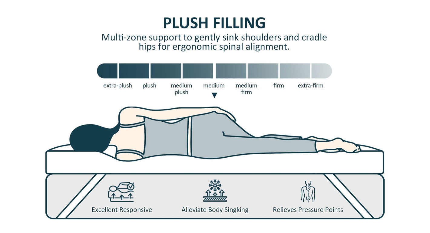 Skin-Friendly Plush Filling for Comprehensive Support. Our filling material incorporates a multi-zone support design, gently cradling shoulders and hips, aiding in achieving ergonomic alignment of the spine. If you suffer from joint pain, back discomfort, or other pains, our product may potentially offer relief, enhancing your overall comfort
